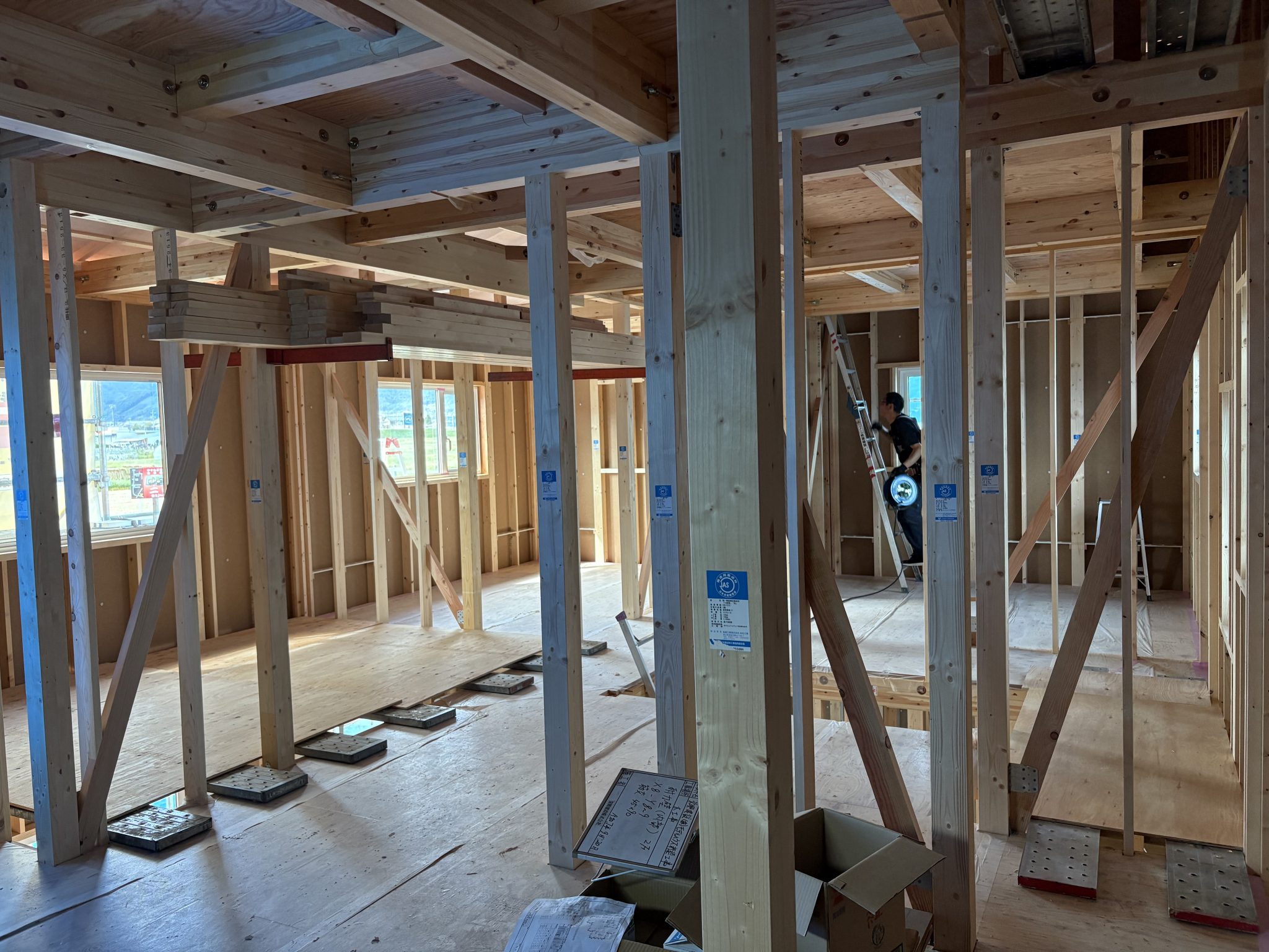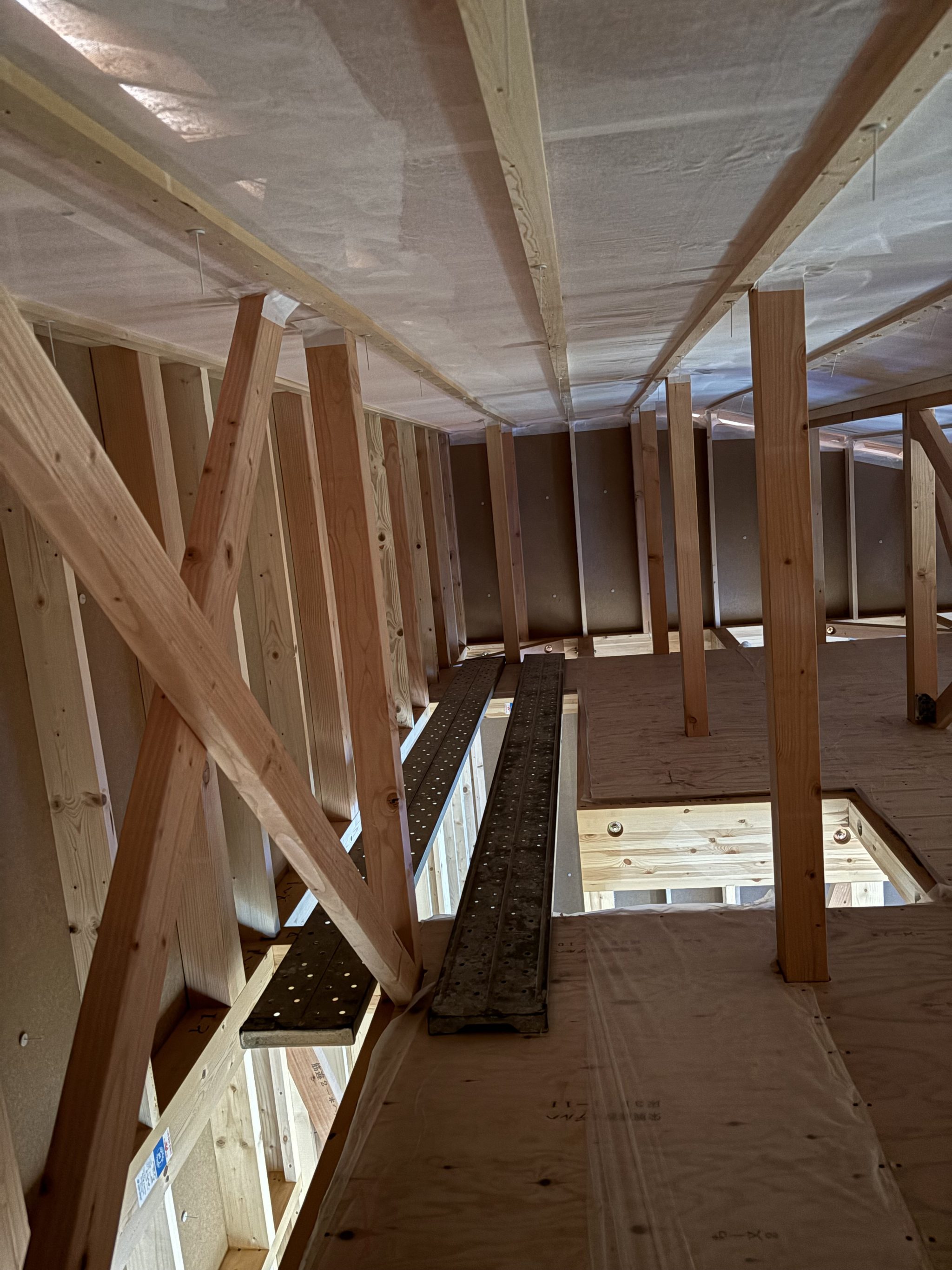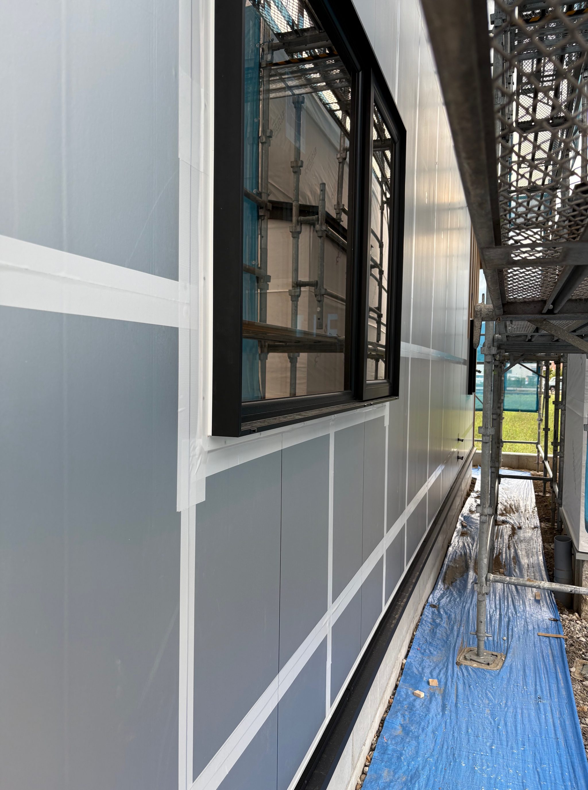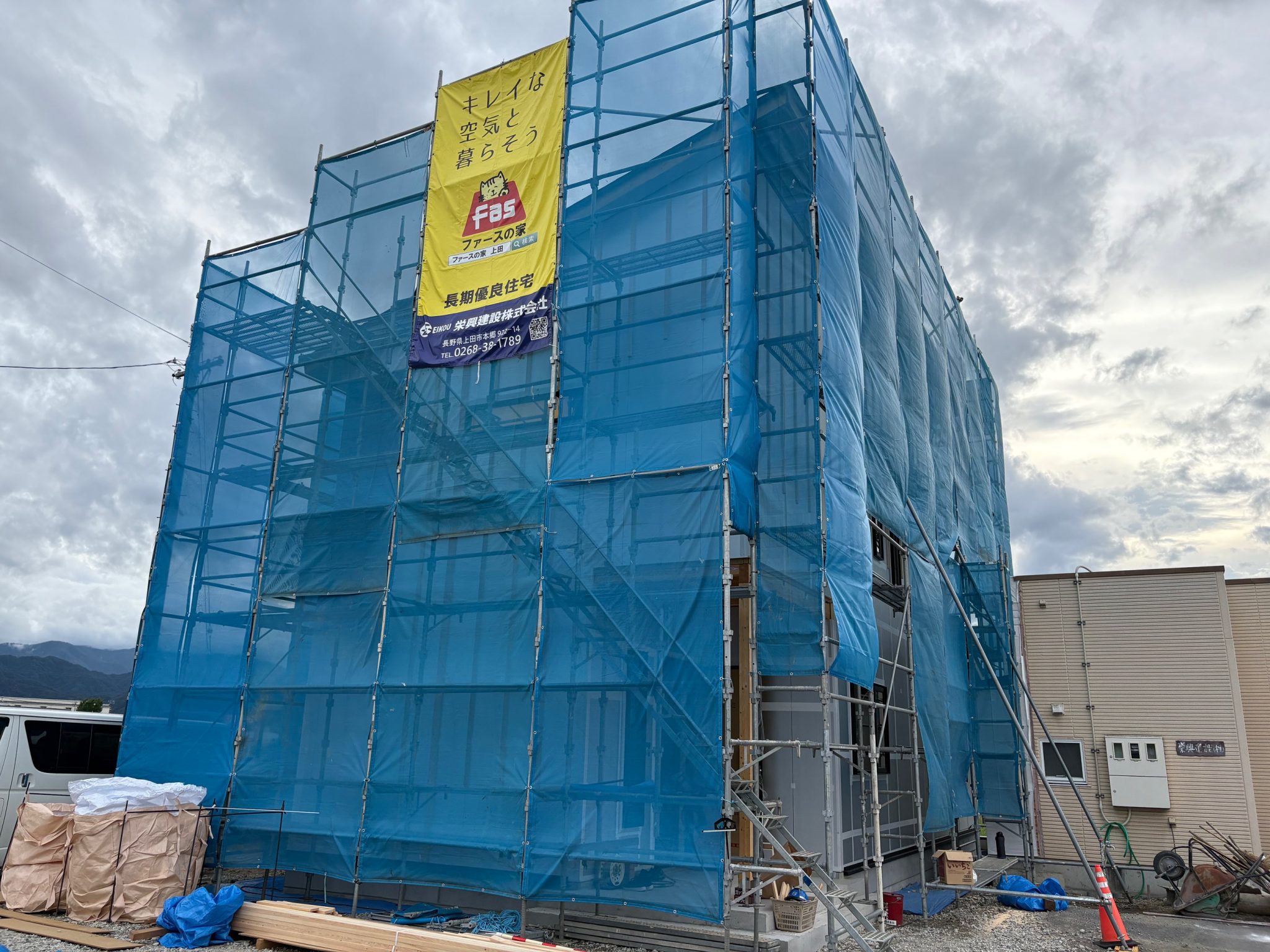 工事中のモデルハウス 内部の画像です。 ファースの家においては、上棟に次ぐ1大イベント 吹付断熱材の工事が来週より始まります。一般的な木造住宅を新築している際はほとんど見かけないと思いますが、吹付前には床下から屋根裏まで掃除をし、材料や道具を搬出するんです。 工事途中ですが一度現場がリセットされる感覚です。 外部の様子はこんな感じです。 外貼りの断熱材で覆われ、これからモルタル塗りの下地作業へと移ります。 来週末には吹付断熱が完了し、印象が大きく変わった様子をお届けします。