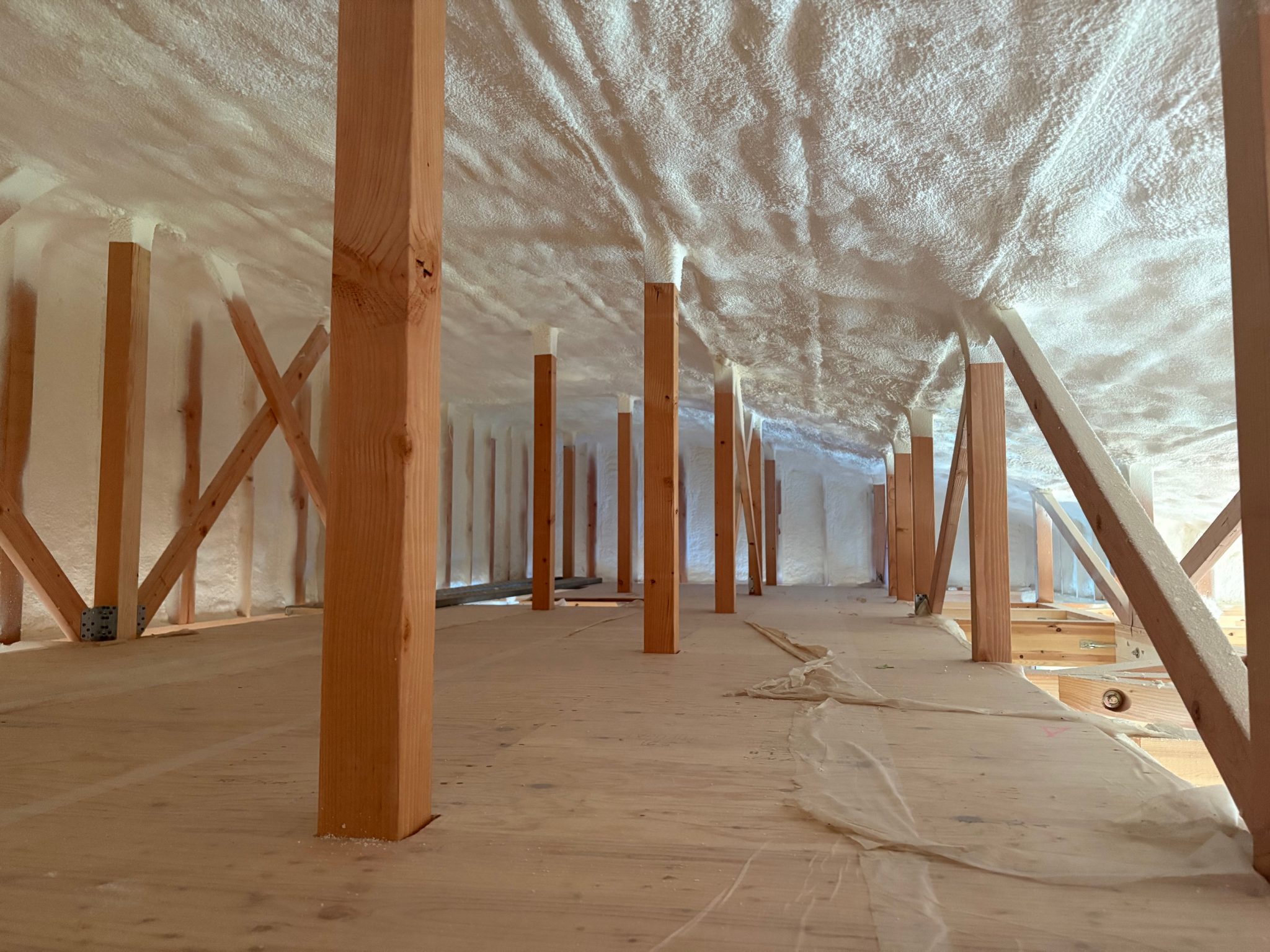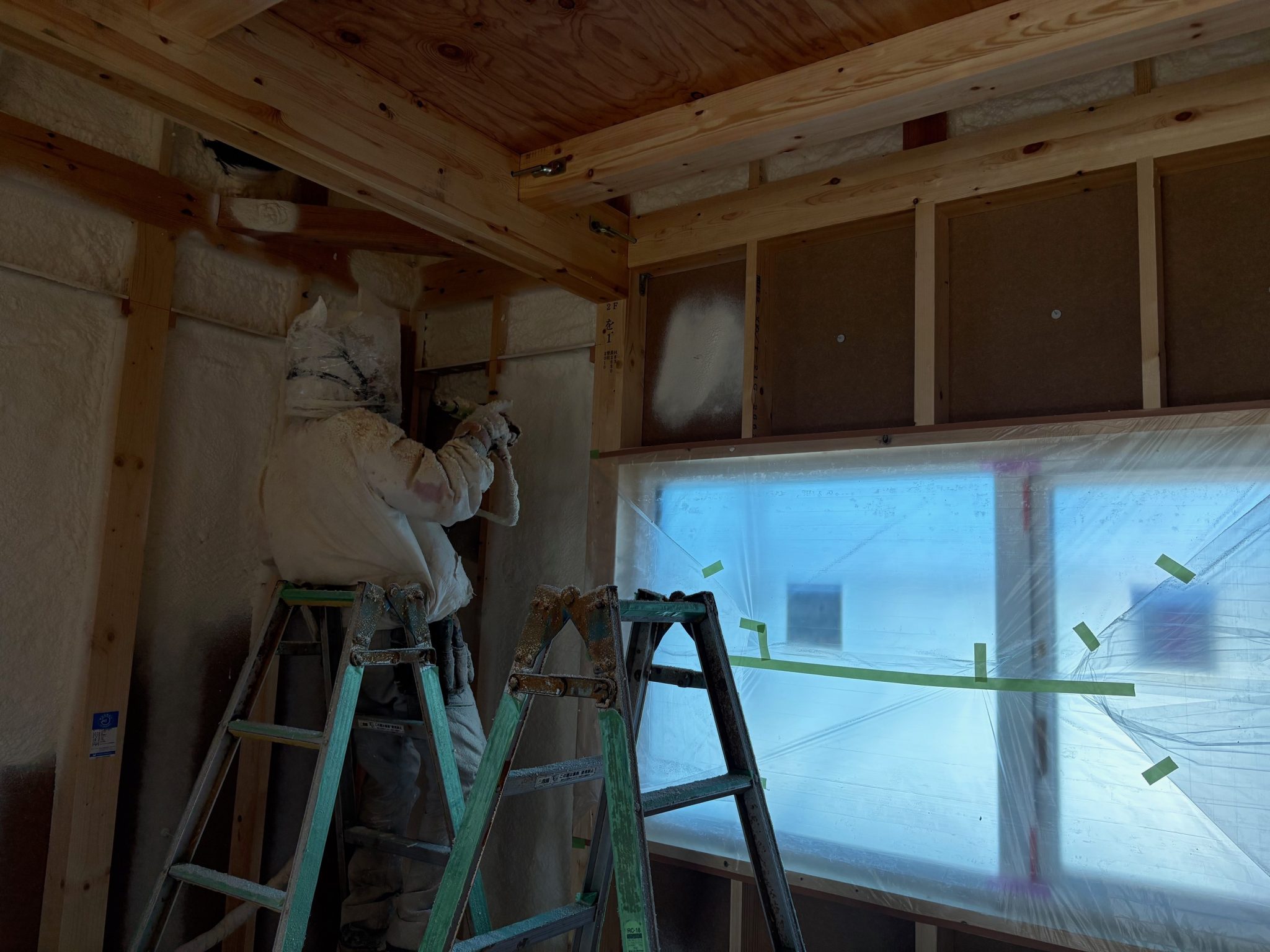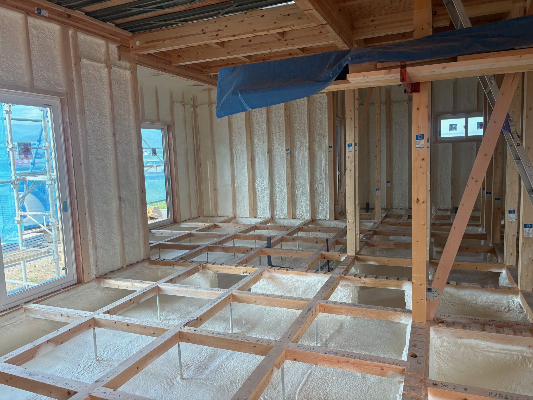今週は吹付断熱材 エアクララ の工事が完了しました。 数ある「ファースの家」の工程の中でも、最重要の工事です。 屋根から基礎のコンクリートまで、すっぽりと白い断熱材で覆われました。 今までは構造や断熱を中心にした工事でしたが、ここから先は仕上げの工程に移ってい行きます。